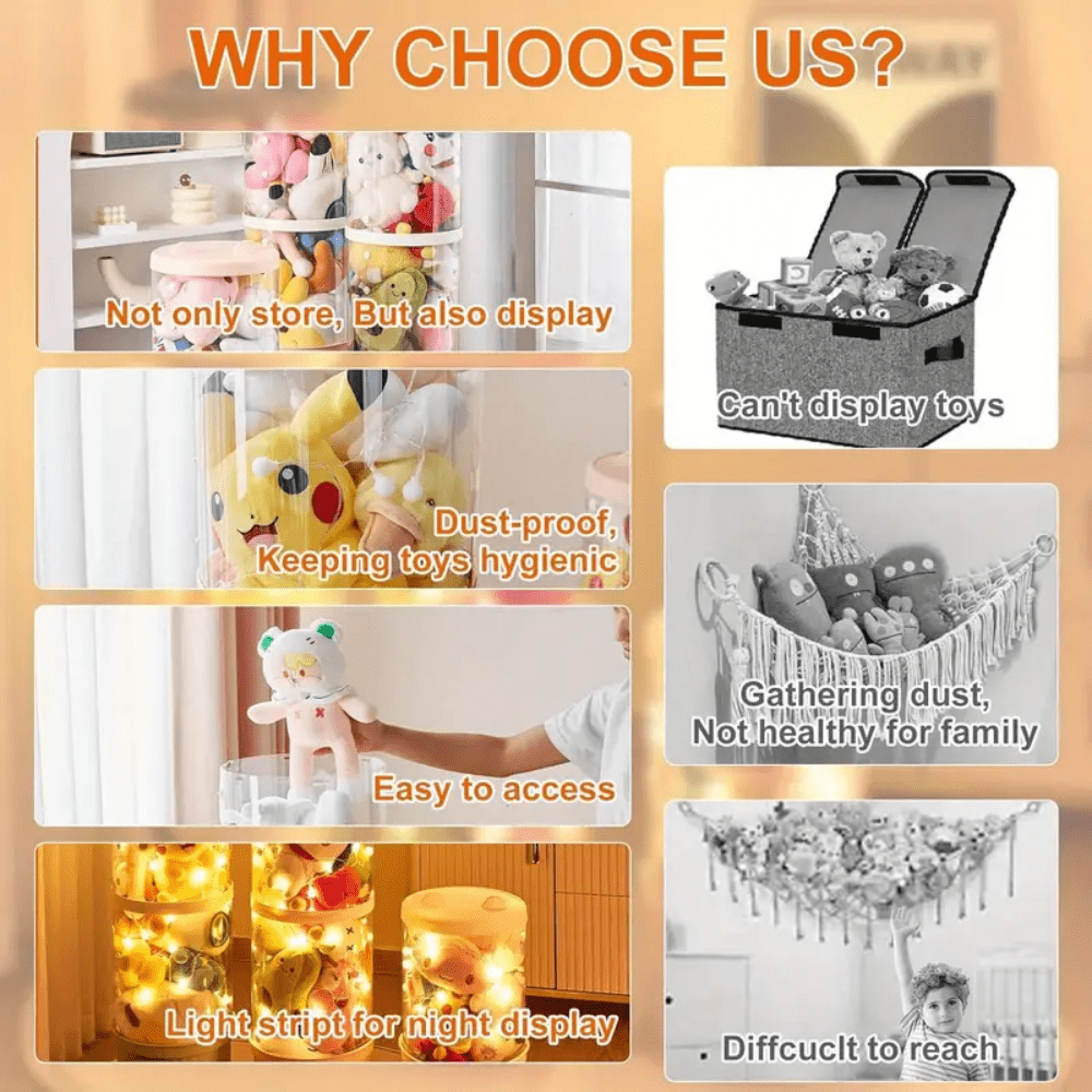 Dustproof Design: The storage bucket features a dustproof lid that keeps plush toys clean and free from dust. The flip-top lid is convenient for preventing dust from reaching your stored items when not in use.