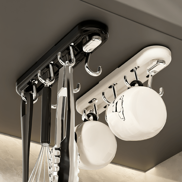 A line-shaped hook system provides a sleek, organized way to store kitchen tools, enhancing the convenience and joy of cooking.